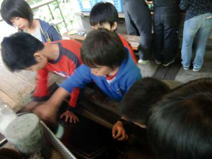 炊飯場では、後片付けのチェックがなかなかきびしく、汚れや炭、こげつきが残っているとやり直しです。友達と力を合わせて一生懸命洗いました。