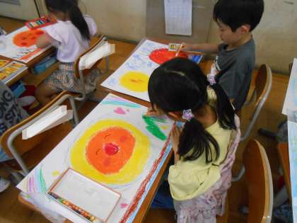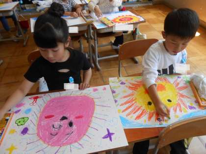 パスを使って大きな画用紙に、すてきなおひさまをたくさんかいていました。