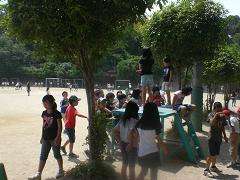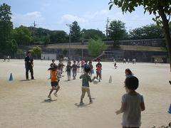 初夏の日差しの中,中間休みには気温もぐんぐん上がっています。熱い中ですが,各学年では「みんな遊び」や「全員遊び」の日を決めていて,多くの子どもたちが運動場で体を動かしています。ドッジボールやサッカーだけでなくおにごっこも人気です。集まって鬼を決める相談をしている学年も見られます。
