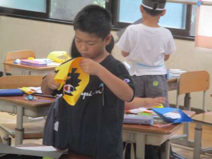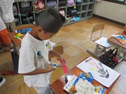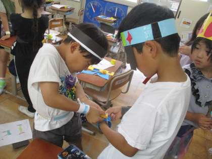 何に変身したいか考えて、輪ゴムやホッチキスを使ってわっかにして工作をしました。忍者やうさぎなど、いろんなものに変身して楽しんでいました。
