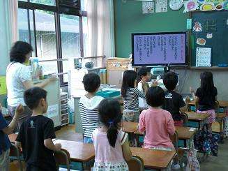 藤城小学校では,朝の会で校内LAN掲示板を活用しています。毎朝,校長先生や各学年のメッセージをみんなで見ています。今日は,音楽集会で歌う歌をコンピュータの伴奏と歌詞を使って練習しました。