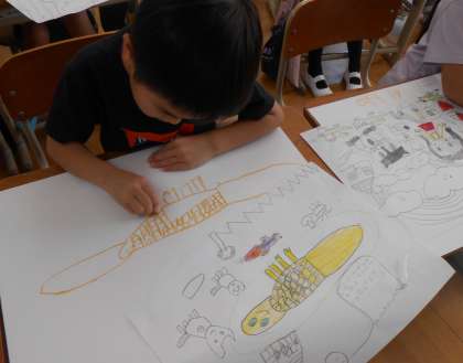 いよいよ画用紙にかきはじめました。コンテを使って、したがきをいながら、ていねいに・・・