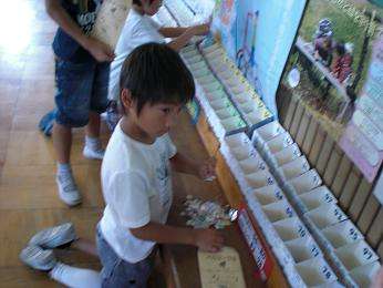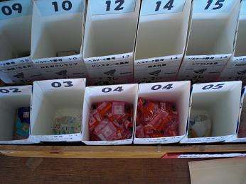 ベルマーク週間で集めたベルマークを持ってきてくれた子どもたちは,番号別にちゃんと分けて入れています。使い終えて交換したあとのインクカートリッジもベルマーク対象のものがあり,集まってきています。