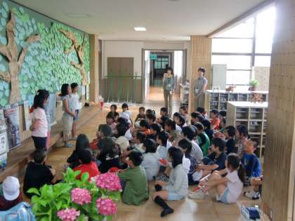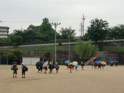 少し雨が降っていたので,昇降口の「なかまの木」の前で出発式をしました。