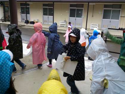 雨の準備をして、所内オリエンテーリングのスタートです。