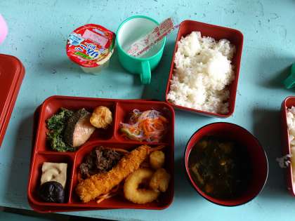 今日の夕食はエビフライがメインのメニューでした。温かい味噌汁がついて、食欲が増しました。