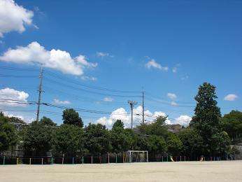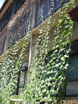 梅雨明けを前に昨日から気温がぐんぐん上がり,真夏を感じる日差しです。青空にもくもくと白い夏の雲が見られます。中庭のみどりのカーテンもぐんと伸びて2階までしっかり届いています。