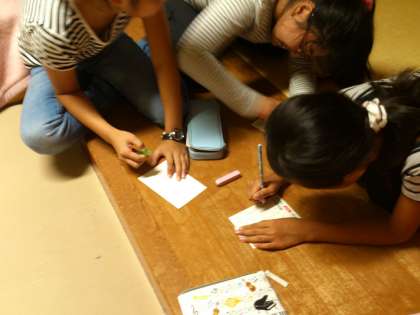 夕食の後、それぞれのお家宛に「自然教室だより」のはがきを書きました。住所や郵便番号を確かめて、ポストに投函します。皆が京都に帰り着いた頃に届くはずです。とうぞお楽しみに!