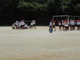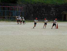 3年生の運動会種目は団体競技「ザ・ハナガサ・タイフーン」です。夏祭りで披露した花笠音頭をアレンジしたダンスと台風の目の竹竿リレーを組み合わせました。まず,長い竹の棒をリレーする練習を頑張っています。