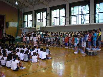 9月9日の日曜日,コンサートホールで開かれる京都市学童大音楽会に5・6年生が出場します。練習してきた成果を全校のみんなに聴いてもらいました。「スマイルアゲイン,スマイルアゲイン笑って見せて・・・みんな好きだから」と自分やみんなを励ます歌詞の歌です。低学年から「心に残る歌でした。がんばって歌ってきてください!」と励まされ,大きな自信になりました。藤城の代表として,心をこめて歌ってきます!