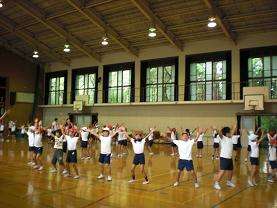1・2時間目に予定していた全校練習は,雨の影響で明日に延期としました。それぞれ明日と振替になった日程で学年練習をしています。体育館では2年生がダンスの仕上げに取り組みました。