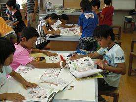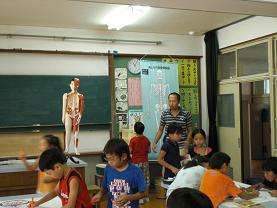 4年生は理科で人の体のつくりについて学習しています。人体の形を大きく紙に描き,骨や筋肉を自分の体や資料で確かめながら書き込んでいます。