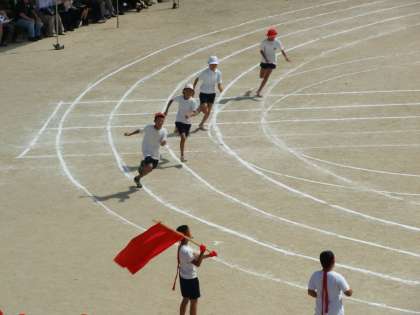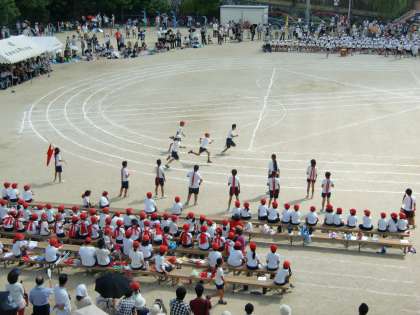 プログラム6番、6年生とたけのこの100メートル走。最高学年の走りを見せます。