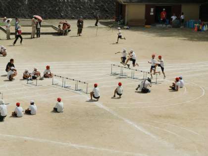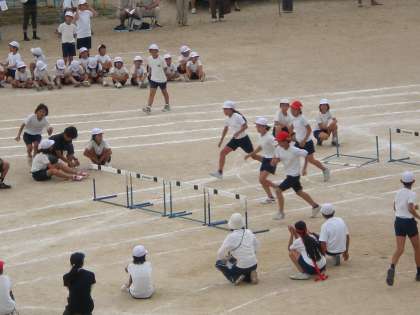 プログラム11番、6年生とたけのこの「50メートルハードル走」。