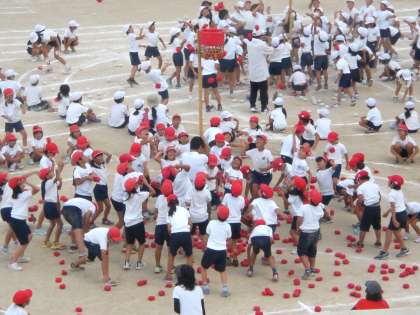 応援合戦に続いて全校種目の玉入れが始まりました。赤、白、青、黄、4色の玉が青空に舞っています。いちばんたくさん入るのは・・・?