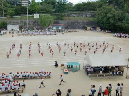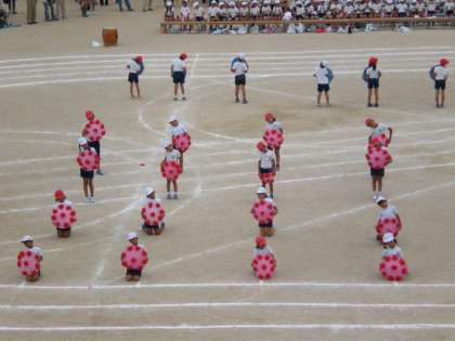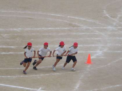 プログラム17番、3年生のTHE HANAGASA TYPHOON が終わりました。夏祭りで踊った花笠踊りはレベルアップ。踊りの後の竹を使ったリレーはハラハラどきどきでした。1年生とたけのこの50メートル走が、始まりました。初めての運動会のかけっこ、がんばれ!!