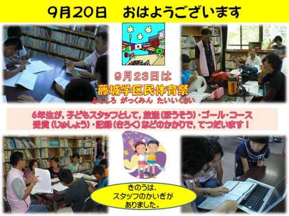 9月23日,第25回藤城学区民体育祭が開催されます。藤城夏祭に続いて,今回は6年の子どもスタッフがお手伝いをします。学校運営協議会で考えた地域の行事に子どもたちをスタッフとして参加させようという取組のひとつです。生き方探究教育の取組としての効果も期待しています。アップさせていただいたのは,全クラスに毎朝発信している校内LAN掲示板,朝のメッセージ画面です。6年生の頑張る姿が,全校の子どもたちのお手本となることを願っています。