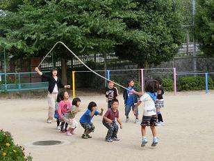 秋の運動場には,休み時間にたくさんの子どもたちが出てきます。夏場との違いは見ただけではっきりとわかります。子どもたちに交じって先生もいっしょにボール運動や縄跳びに取り組む姿が見られます。先生といっしょで,子どもたちも嬉しそうです。