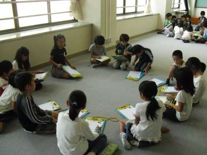 生活科の学習で「みんなワッショイあきまつり」の準備を進めています。今日は、「おみこしグループ」と「おどりグループ」に分かれて話し合いました。