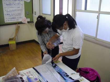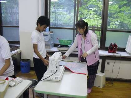 保護者の方々も応援に来てくださり,しつけの仕方やミシン縫い,アイロンがけなど,たくさんお手伝いいただけました。子どもたちも安心して取り組めています。