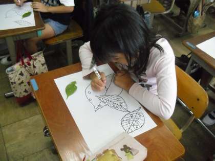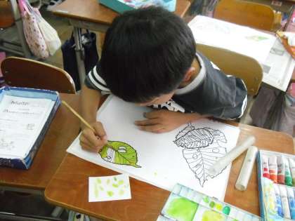 今日は,図工の時間にクロッキーをしました。落ち葉をよく見ながら,和紙に描いていきます。ペンで描くので,「失敗しないかな…」とドキドキしていましたが,みんな,しっかり観察しながら集中して描いていたので,とても上手に出来上がりました。虫に食われたところや葉の模様など細かいところまで表現できていて,先生も驚きました。その後,1枚だけ葉に色をつけたのですが,少しずつ葉の色が変わっていくのを考えながら絵の具で色をつけることもできました。あとは,全部の葉に色をつけて,自分で作った詩をのせたら完成です。素敵な作品になることを楽しみにしています。