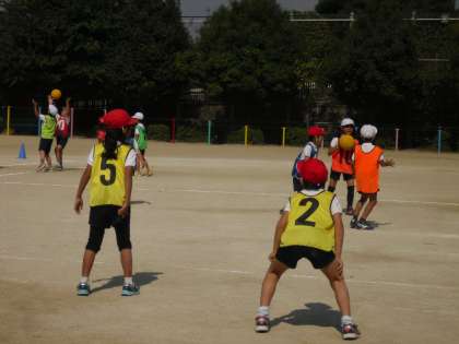 今日で2回目のエンドボール。今回は,ゴールマン・ガードマンが必要なので,フォワードが2人になっています。パスを出したらすぐに自分のゴール目指して走る!気を抜いている暇はありません。パスパス作戦,ゴールマンの動きの工夫など,それぞれチームで作戦を考えてゲームを進めています。