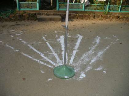 空を見上げると,雲ひとつない青空。これは理科の学習日和。そこで,太陽とかげの関係を調べました。1時間ごとに,太陽の位置を確認し,立てた棒のかげを記録しました。すると,1時間ごとに描いたかげの位置は,同じくらいの間隔で動いていることに気づきました。