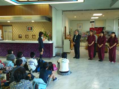 おはようございます。全員元気に朝を迎えました。宿舎の窓からは朝日に輝く海が一望出来る素晴らしい眺めです。朝こはんをいただいた後、退館の挨拶をしてリトルワールドへ向かいます。
