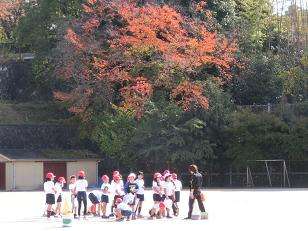 運動場のやまざくらは,赤く色づき風が吹くたびに落ち葉が舞います。運動場の端っこの鉄棒の周りは落ち葉のじゅうたんです!日に日に秋が深まっています。