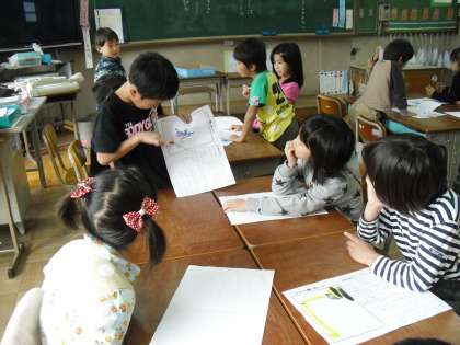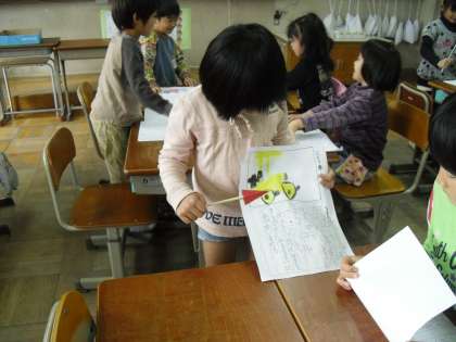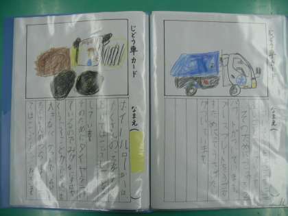 国語の「じどう車くらべ」では、いろいろなじどう車の「しごと」と「つくり」について学習してきました。そのまとめとして、自分の選んだじどう車についてじどう車カードを作り今日は、グループで交流しました。ミキサー車・ロードローラー・せいそう車・ショベルカーなどいろいろなじどう車が登場して、「はじめて知りました。」と感想を伝えている子もいました。みんなのカードを1冊にまとめて、1の2のじどう車ずかんが完成しました。