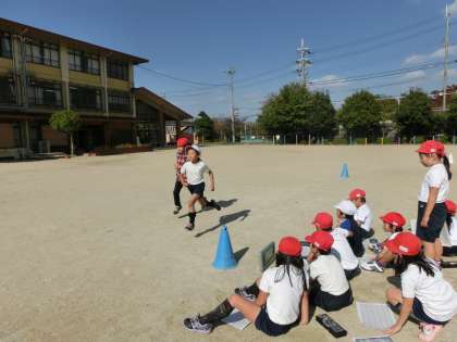 「かけあし」では,4分間,自分に合った速さで運動場を何周走ることができるのかをペアの友達と数え合いました。
