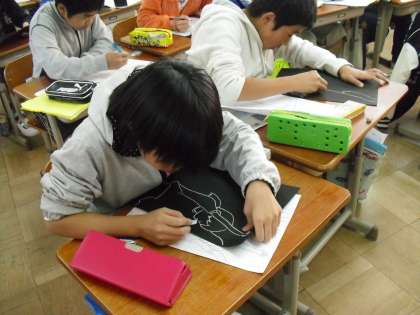 図工では,版画づくりにとりかかっています。思い出の組体操の一場面をとりあげ,版画にします。今日は,完成のイメージをもつために,下絵を白と黒に塗り分けました。