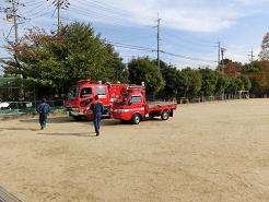 消防車が校庭にやってきたので,子どもたちはびっくりです。日曜日の自主防災訓練の用具を運んでこられたのです。体育に時間に運動場で学習していた子どもたちは,大盛り上がりでした。近くで見る消防自動車は,やはり迫力がありました。