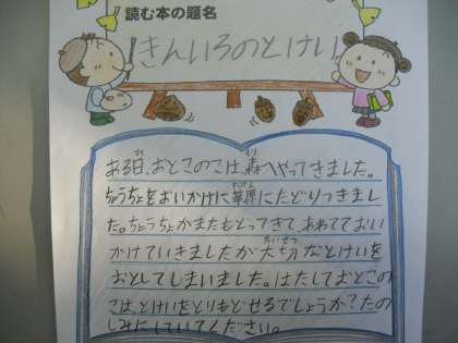 明後日の金曜日、兄弟学年の6年生が、1年生の子ども達に絵本の読み聞かせにきてくれます。今日は「こんな本を読みます。」というお知らせの手紙を持って、1年生の教室を訪ねてくれました。当日読み聞かせをしてくれるお兄さん、お姉さんから手渡してもらうと、目を輝かせて読んでいる子ども達でした。「この本知ってる。」など思い思いにつぶやきながら、隣同士で見せあいっこをしていた姿に、みんなのわくわくする気持ちが感じられました。