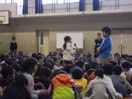 5つのグループが,劇やペープサート,プレゼンなどを使って,全校の友達に伝わるように工夫して発表しました。発表方法も原稿も自分たちで考えたので,苦労した部分もありますが,今日の発表にむけて,みんなよくがんばりました。
