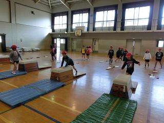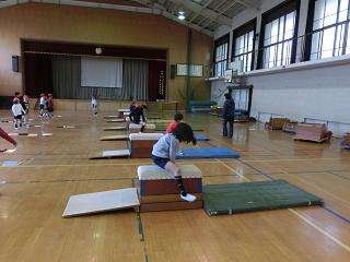 1年生は,体育館でとびばこにチャレンジしています。踏切り板を使って,うまくとべるように何回も練習して,もっと高い段もとびたいです。