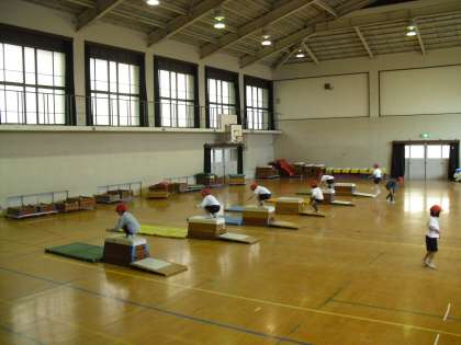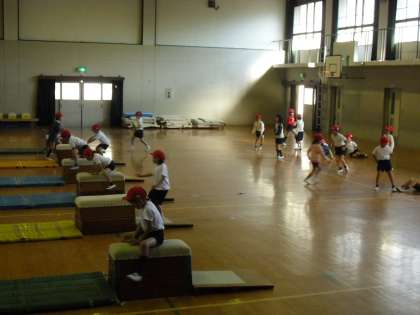 1年生のとびばこあそび、今日は3段のとびばこです。