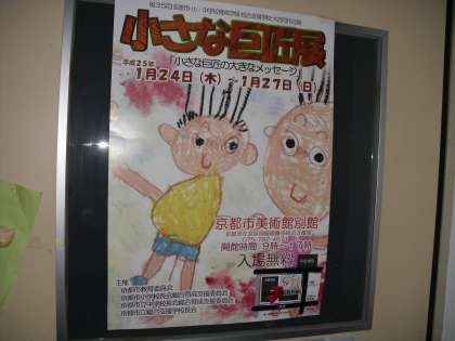 小さな巨匠展は、市内の小中学校の育成学級、総合支援学校の合同作品展です。岡崎の京都市美術館別館で24日から27日まであります。たけのこ学級では、24日に鑑賞に行く予定です。皆さんも、時間があれば見にきてください。ポスターを昇降口に貼ってあるのでご覧ください。