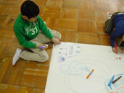 15日に、小さな巨匠展に向けての作品つくりのために、附属特別支援学校と2回目の交流学習をしました。1回目は、ダンボールに絵の具で塗りたくりをして、今回はそのダンボールに貼る絵を描きました。みんな楽しく活動ができました。どんな作品になるのか、巨匠展に鑑賞に行くまでは、わかりません。とっても楽しみにしています。