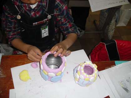 図工で,「空容器」と「紙粘土」を使って,普段の生活の中で使えるものを考え,作りました。ペン立て,小物置き,リモコン置き,宝物箱等作ったらすぐに使えるものばかりでした。色使いや,形をくふうして作っていました。