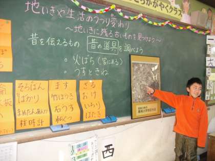 社会科の学習で,昔使っていた道具について学習しました。昔使っていた道具にはどんなものがあるのか。どんな使い方をするのか。どんな時に使うのか。知りたいことがたくさん出てきました。来週は,実年会の方々にお世話になり,「昔の道具」についてのお話を聞かせていただきます。その後,七輪の使い方を学び,火をおこし,お餅を焼いて皆で食べる予定です。