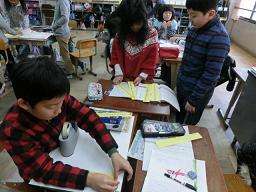 4年生は,国語の物語「初雪の降る日」を学習しています。今日は,それぞれの子どもたちが持った読後感「ふしぎ・こわい・不気味」「ほっとした・よかった」などの思いがが,文章のどの表現から感じられたのか見つけました。「ゴムまりみたいにはずんで」「手足はかじかんで」などをカードに書いてグループで理由を交流して発表しました。作者の安房さんが読み手に伝わるよう選んで書いたのでは,と気づいたグループもあり,言葉にしっかり着目できた学習でした。