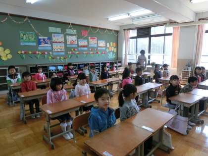 「てはひざ あしぴた せなかぴん〜♪」とメロディを歌いながら,正しい姿勢を学習しました。とっても良い姿勢で,すばらしかったです!