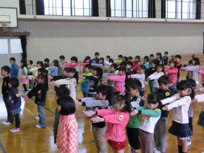 今日は一年生全員で合同体育をしました。ならびっこをしました。まず名簿順の並び方を練習しました。そしてタンバリンに合わせて自由に体育館の中を動き回り、合図があったら、担任の前に習ったばかりの名簿順で並んで、前にならえをするということを何回も繰り返しました。動き回る時には、カエルやぞうやペンギンになって楽しく動きまわりました。初めての並び方でしたが、みんなしっかり覚えて上手に並べていました。