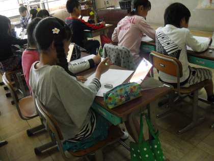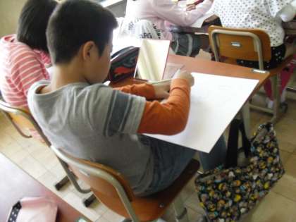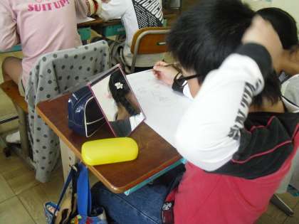 図工の学習で,自分の顔を描きました。鏡にうつった顔をよく観察して,目や鼻の位置などをさわって確かめながら,丁寧に線を描いていきます。最初は難しそうにしていた子ども達も,どんどん進めていくにつれて「自分に似てきた!」などと楽しくなってきたようでした。次の図工の時間には,絵の具で色を塗っていく予定です。出来上がりが楽しみです。