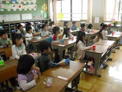 フッ化物洗口が今日から始まります。1年生は初めてなので、今日は水で練習をしました。テレビの画面にあわせながら、口の中をぶくぶくぶくぶく。みんな、上手にできていました。さあ、来週も上手にできるかな。