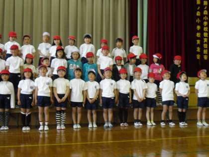 来週の金曜日の「一年生をむかえる会」に向けて、昨日から一年生みんなで練習を始めました。今日は体育館で本番のように三段のひな段に並んで練習しました。昨日の多目的室での練習とは大違いで、呼びかけの声の大きさも体育館いっぱいに届くほどで、歌もしっかりふりをつけて歌えていました。練習場所によって子ども達の心構えもこんなにちがってくるのだと感じる一時間でした。