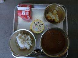 毎日の給食にすっかり慣れた様子の1年生。今日は,ハッシュドビーフ,ギャー万ポテトがメインの洋風献立です。おかわりして食べる子たちもいます。デザートにプリンがついてとてもうれしそうです。