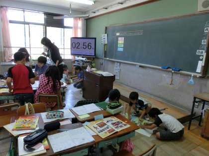 前日(16日)に行った消防署の見学を思い出し,「訓練」「建物」「消防士さんの工夫」などについて,付箋に書きました。その後,グループごとに模造紙に貼ってまとめていきました。