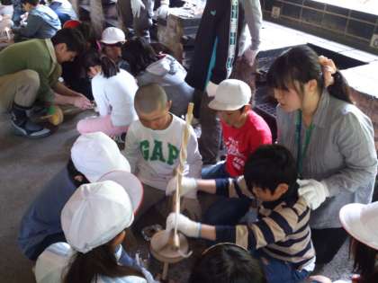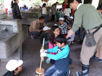 山の家の先生の指導で巻き上げ式火起こし機を使い、